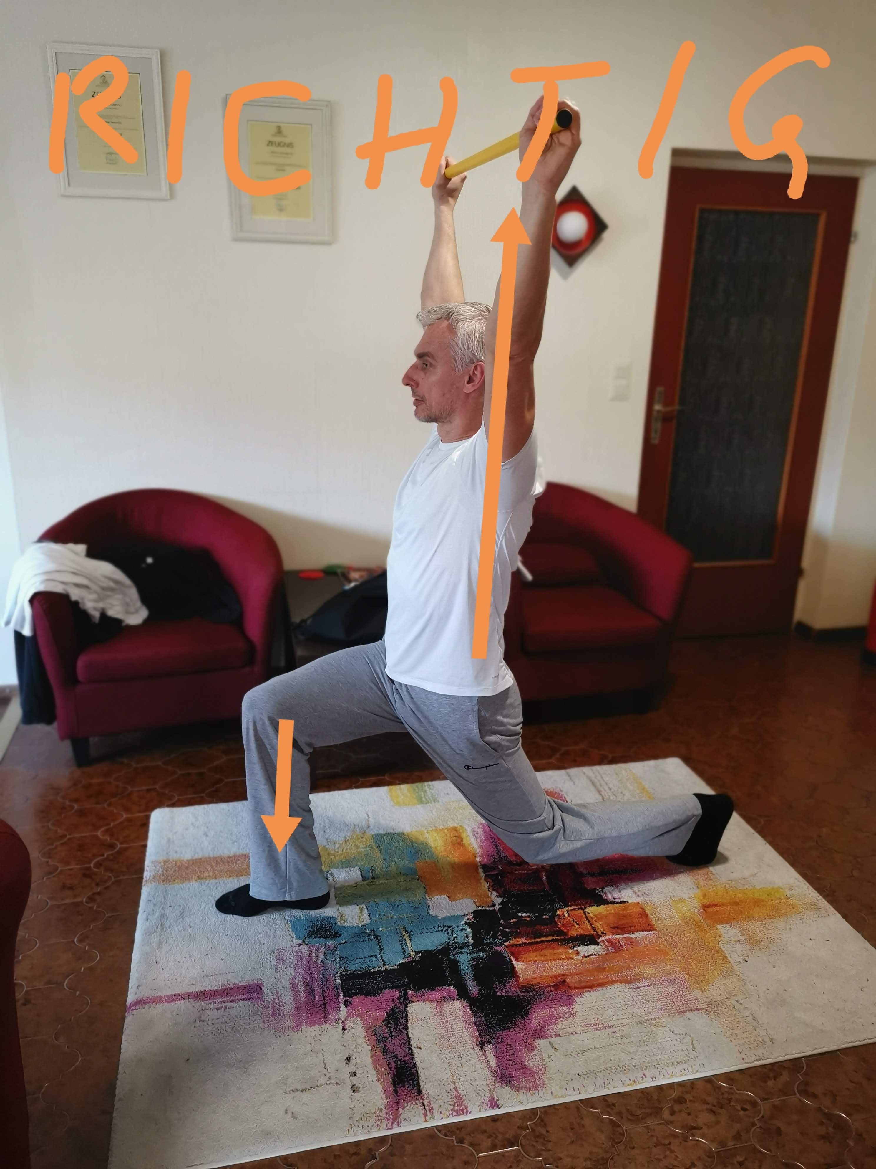 2. Jetzt geht’s um die Beine und den Rücken. Starke Beine und stabiler Rücken sind die wichtigsten Voraussetzungen für die meisten Übungen. Es kommt natürlich noch der Bauch dazu, aber zuerst die zwei Dinge. Wir brauchen bloß einen Stab oder Besenstiel dazu.